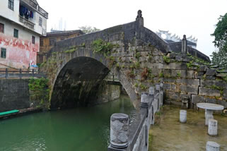 石板路旁的房子多為青磚、青瓦的兩層明清建筑,歷史滄桑隨處可見(jiàn)。每棟房子設(shè)計(jì)十分合理,集商住于一身,均由門前、天井、正房、廂房、后院組成?拷值囊话阕麂伱鎻氖律虡I(yè),有樓梯可上二層。往里走是天井,一般都栽有花草,利于采光;天井后是正房,高大寬敞,供著神像及祖宗牌位,是主人活動(dòng)、會(huì)客的地方;兩邊是用來(lái)居住的廂房。正房、廂房的門窗上都雕有花紋;正房后有門可到后院,后院臨江并建廚房和廁所,有石階可到江邊取水、洗衣。到大圩,萬(wàn)壽橋是必去的地方。萬(wàn)壽橋詩(shī)建于明代,是一座石塊砌起的石拱橋,橋面的石頭已被磨得溜光發(fā)亮,間雜些許小草,古樸自然。橋的西面是漓江,是欣賞漓江及對(duì)岸螺螄山的極佳位置。