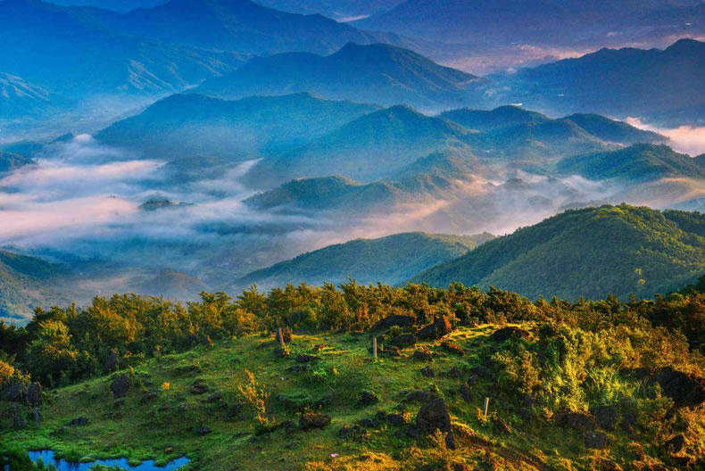 地貌 境內(nèi)地勢西北高東南低,主要是十萬大山和其支脈東山,以及一些零星山脈,山脈呈東北——西南走向,平面形狀略呈菱形,一般坡度35°—45°之間。北倚十萬大山,西北峻嶺林立,高峰挺拔,最高峰為板八村的久寶山,海拔1448米;中部山丘錯雜,連綿起伏,東南是丘陵地帶,間有小塊平原。
