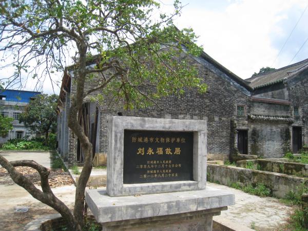 劉永福故居其中一處位于那良鎮(zhèn)圩邊的那營村。建于清光緒二年(1876年)。主建筑為磚木結構,二進十間房屋,中有天井,兩側(cè)為廂房,有回廊相通,屋檐以琉璃瓦裝飾,是一座典雅古樸的建筑。