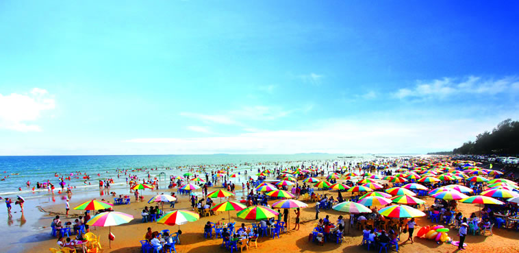 金灘,位于京族萬(wàn)尾島的南邊,全長(zhǎng)13公里,與越南的風(fēng)景名勝區(qū)萬(wàn)柱島隔海相望。金灘沙細(xì)、坡緩、水清、浪平,且無(wú)海藻、無(wú)鯊魚(yú)、無(wú)污染。沙灘由海岸緩緩斜入海中,是集陽(yáng)光、沙灘、海水于一身的天然“三·S”海濱浴場(chǎng)。岸上有20多公里長(zhǎng)的椰樹(shù)、木麻黃觀光林帶。金灘空氣氧離子含量是內(nèi)陸城市的500~1000倍,最高氣溫33℃、最低氣溫6℃,年平均氣溫在20℃~23℃之間。