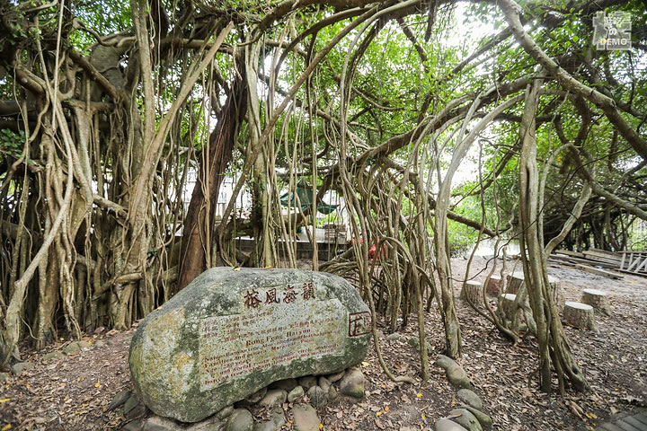 竹山古榕部落由一棵一千三百多年的古榕和眾多小葉榕組成。古榕為高山榕,榕樹(shù)高大挺拔,樹(shù)干需十三個(gè)成人張開(kāi)雙臂才能合抱。而這一株株榕樹(shù),也許是海風(fēng)終年吹拂的緣故,榕樹(shù)長(zhǎng)到一定高度后就橫向生長(zhǎng),長(zhǎng)出許多氣根,氣根接觸地面后長(zhǎng)成一根根枝干,這樣的氣根不知多少,數(shù)不勝數(shù),遠(yuǎn)遠(yuǎn)望去,一株榕樹(shù)就是一片樹(shù)林,在綠茵如水的野芋叢中,構(gòu)成了“頃地一古榕,飛瀑掛潭中”的佳景,打造了古榕部落“雙龍出海”、“四郎探母”、“六柱擎天”、“八仙會(huì)聚”以及榕樹(shù)瀑、榕樹(shù)墻、榕樹(shù)戀、榕樹(shù)侶等惟妙惟肖的生態(tài)奇觀。