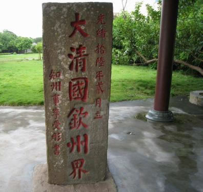 大清國(guó)一號(hào)界碑位于北侖河出海口的小山坡上,碑高1.7米,寬0.7米,厚0.4米,用沿海所產(chǎn)的海蝕巖鑿成。界碑正面書(shū)“大清國(guó)欽州界·知州李受彤書(shū)·光緒十六年二月立”,涂著紅漆的莊嚴(yán)雄渾的大楷碑文透著一股不可侵犯的凜然正氣。這塊飽受長(zhǎng)年風(fēng)吹日曬雨淋而益顯滄桑的巨石,一直昂揚(yáng)地巍然屹立著,向每一個(gè)游客訴說(shuō)著100多年來(lái)的每一段歷史。