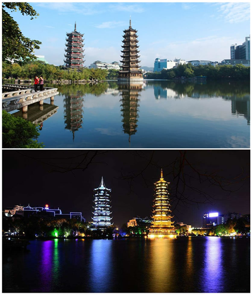 日月雙塔地處桂林市中心區(qū),坐落在桂林城的中軸線上,與“象山水月”相鄰。象山是桂林的城徽,而雙塔則是新桂林的標(biāo)識。日塔、月塔與象山上的普賢塔、塔山上的壽佛塔,相互呼應(yīng),相互映襯,有“四塔同美”之說。桂林日月雙塔號稱世界第一銅塔,是桂林旅游的一個夜景觀賞地。