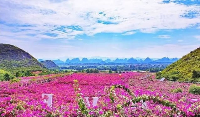 桂林花海景區(qū)位于臨桂區(qū)六塘鎮(zhèn)誠(chéng)桂村委何家橋、黃家莊一帶,處于“桂林黃金旅游大通道”桂林—陽(yáng)朔321國(guó)道中段,距離桂林30千米,交通便捷。景區(qū)由緊鄰桂陽(yáng)公路的2000多畝青山峻嶺及峽谷300畝土地組成。