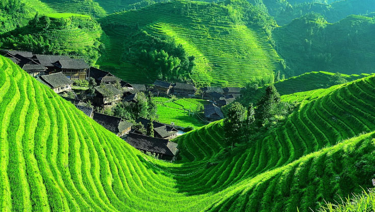 龍脊梯田,因山脈如龍的背脊而得名,是廣西著名風景區(qū),始建于元朝,有近700年的歷史。龍脊梯田景區(qū)主要分為平安壯寨梯田和金坑紅瑤梯田。平安壯寨梯田有“七星伴月”和“九龍五虎”兩大著名景觀;金坑紅瑤梯田有“大界千層天梯”,“西山韶樂”和“金佛頂”三大著名景觀。這里的壯、瑤民族世世代代居住在青瓦木樓之中,淳樸善良。金竹壯寨被聯(lián)合國教科文組織稱為北壯的楷模;黃洛紅瑤寨獲上海大世界吉尼斯集體長發(fā)村之最;龍脊古壯寨至今保留著許多文物古跡。