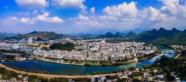位置境域 恭城瑤族自治縣位于廣西壯族自治區(qū)東北部,桂林市東南部,東與富川瑤族自治縣及湖南江永縣交界,南與鐘山縣、平樂(lè)縣毗鄰,西接陽(yáng)朔縣、靈川縣,北臨灌陽(yáng)縣,縣城距桂林市108公里;全縣東西最長(zhǎng)橫距56千米,南北最長(zhǎng)縱距75千米,版圖總面積2139平方公里。