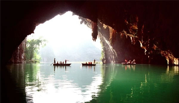 百鳥巖位于甲篆鄉(xiāng)烈屯西北面的漠齋山下,別名龍虎洞。因洞內(nèi)燕子棲集,蝙蝠掠飛,又名百鳥洞。盤陽河自吉屯白熊洞潛入山下,形成1000多米的伏流暗河后,在此洞流出。洞口寬50米,一石壁把洞口分成兩個(gè)略呈三角形的左右洞口。左側(cè)洞口寬40米,高15米,兩洞口內(nèi)側(cè)相通。洞深500米,蜿蜒曲折,直通與白熊洞一山之隔的拉類坳下的一個(gè)側(cè)洞口。洞中水平如鏡,深不可測,寬處約40米,窄處10米,從洞口行舟至300米轉(zhuǎn)折處,距水面30米處有一圓形天窗,山坳之光照到水面,猶如舞臺(tái)上的光束,色彩紛呈,近右側(cè)洞口處有沙灘,可?恐鄞I碁┯覀(cè)是一塊30多平方米的石臺(tái),臺(tái)面深溝淺窩,坑坑坎坎,石臺(tái)一側(cè),洞壁雪白,可攀援其中。有石鷹、石柱、石幔、石觀音菩薩等,百態(tài)千姿,令人目不暇接。石臺(tái)的周圍有仙女梳妝、海螺石,石螺對面有石桌、石缸和石松果等。側(cè)面洞口外香椿林下野花艷目植被繁衍,把洞口點(diǎn)綴得幽靜雅致。洞中歧洞叉水道不可勝數(shù),密如蜂房,不知所向,整個(gè)洞仿佛一座裝飾華麗、景幻莫測的水下龍宮。其奇特的景象似桂林蘆笛巖,又因非乘舟不能游覽,游人贈(zèng)予“水上蘆笛巖”的美譽(yù)。