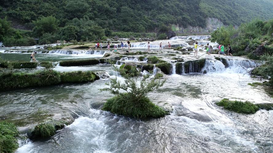 響水瀑布洛江灘頭,河水奔流而下,其聲隆隆,遠聞若雷,近聞似鼓,四季如此,故此得名“響水”。此響水灘為典型的喀斯特地貌,水流呈階梯狀分布,在地質(zhì)學上稱為邊石壩,所含成份多為鈣化石?膳c九寨溝五彩池比美。