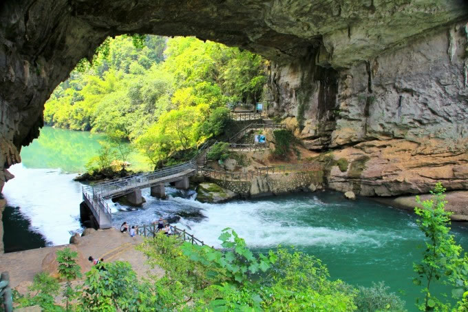天生橋橋洞拱高35米,橋面長寬度各40米。這里有一個美麗動人的傳說,以前這里沒有橋,過河極為不便,遠在洛陽的魯班師傅知道后,揮動他手中的板斧一揮而就,當?shù)氐睦习傩諡楦兄x他,就送了三顆香桃給他,當時正值陽春三月,桃紅柳綠,魯班師傅就把此橋稱之為“香橋”。