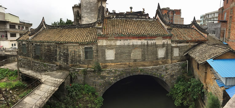 登龍橋在西河流向圭江的入口處。據(jù)資料記載,該橋始建于宋元年,全長36.3米,拱跨10米,高5.5米,寬13.5米。橋面一邊為橋的通道,中間建風(fēng)雨亭,為歇山頂磚木結(jié)構(gòu);一邊建殿堂,青磚砌墻,青瓦覆蓋,硬山頂磚木結(jié)構(gòu)。頂部磚砌灰雕花脊,兩端飾鰲魚,中間為火球。殿內(nèi)墻端繪飾古壁畫,園木柱作頂柱。橋東牌坊上刻著“登龍橋”三個大字,整座建筑風(fēng)格獨特,莊重樸實。為北流八景之“龍橋夜月”所在。
