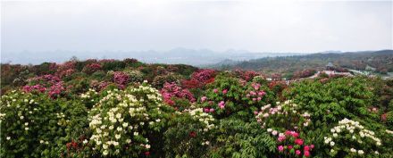 初步查明,百里杜鵑風(fēng)景區(qū)有馬纓杜鵑、大白花杜鵑、水紅杜鵑、露珠杜鵑等41種,占世界杜鵑花5個亞屬中的全部;ㄉ鄻,絢爛生輝。每年3月到5月次第開放,百里花山色彩繽紛,猶如廣袤的錦緞華章鋪山蓋嶺,百態(tài)千姿。被譽為“地球彩帶、世界花園”。