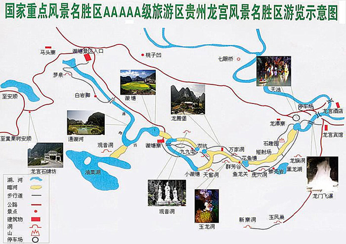 10、龍宮—安順—格凸河:由X007六鎮(zhèn)高速延伸段至安順,縣道至紫云(75公里),游道至景區(qū),里程共102公里,耗時約2小時10分鐘;