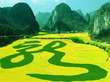 在龍宮漩塘景區(qū)通漩河左岸的田地里,春季采用的是油菜花和蠶豆套種,秋季采用普通水稻和黑糯米水稻套種,占地面積120畝,折合約8萬余平方米的“龍”字景觀是從2009年2月下旬起,貴州(龍宮)第七屆油菜花旅游節(jié)期間開始推出的。