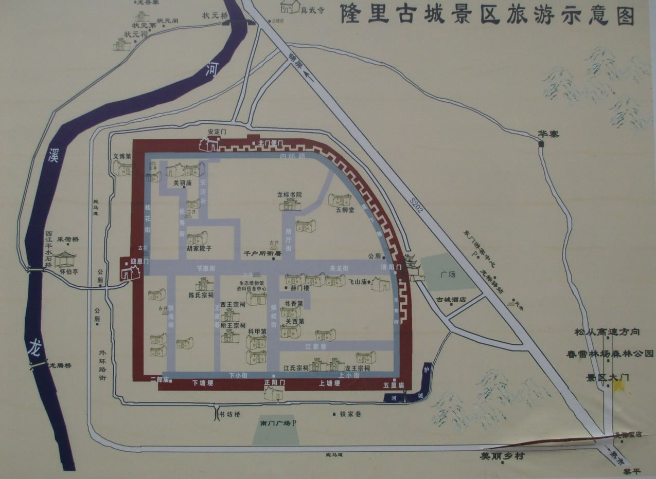 古城近似長方形,南北寬217米,東西長222米。城垣始建為泥土夯筑,天順元年(1457年)改以卵石框邊。周長1500米,城墻高一丈二尺,壕深一丈。 城周三里三分,東南西北各設炮臺一座。全城設東南西北四道城門,東門為清陽門,又名戌門,門上建有三層高戌樓。東門主要是作為官員、軍隊等進城之門,取“紫氣東來”之意。南門為正陽門,西門稱迎恩門,除了門上建有兩層戌樓外,還設置了內外兩道城門,即在門洞前筑有一堵圍墻,出門洞后需轉九十度彎再出一道門才能到達城外。這結構被隆里人稱為“勒馬回頭”。古語中“北”、“敗”音相近意可互通,而“敗”字無疑犯了兵家之大忌,故北門常年閉門不開,且為取其藏風聚氣之說,在北門上城樓上設有寺廟,供奉有菩薩,以祈求平安。城墻上設有跑馬道,城壁設有“天燈座”,用以傳遞訊息。古城墻外有護城河,以防敵人侵襲。