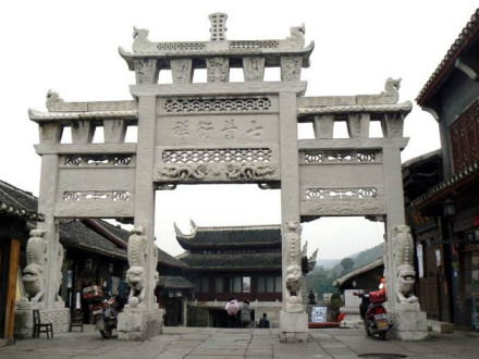 青巖古鎮(zhèn)城中原有八座牌坊橫跨在石板鋪筑的大街上,如今尚存兩座百歲坊和一座貞節(jié)牌坊。定廣門內(nèi)的趙理倫百歲坊,是清道光二十三年(1843年)奉旨建造的。它是一座四柱三間、三樓四阿頂?shù)氖品唬?.5米,寬約9米。精心雕琢的石牌坊,在藍(lán)天白云之中,顯得空靈。正中的橫額上,鐫刻著道光皇帝的題額,正面是“七葉衍祥”,背面是“升平人瑞”,上端有“欽賜”二字。抱柱的四對(duì)石獅子非同尋常,不是站獅,也不是臥獅或蹲獅。八頭獅子仿佛是從高山上俯沖下來,富有靈性。