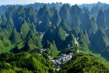 從地質(zhì)學(xué)的角度看,北部為峰林盆地,中南部為峰林洼地和峰叢山地,峰林、峰叢大多為呈錐形,部分為鐘狀、平頂狀和馬鞍狀,堪稱一座“中國(guó)錐狀喀斯特博物館”。南北兩段峰林也各具特色,北部峰林如同一道屏風(fēng),護(hù)佑著耳寨、魚隴、雙生、樂立一帶的村寨田園。這里奇峰如林,田壩似錦,河水如帶,村寨如云,充滿詩(shī)情畫意,恰似一幅樸素、清麗的布依族織錦。