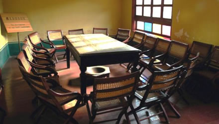 原為房主的小客廳。 會(huì)議室呈長(zhǎng)方形,面積27平方米,室內(nèi)陳設(shè),基本上是當(dāng)年開(kāi)會(huì)時(shí)的原貌。屋子正中的頂壁上懸掛著一盞荷葉邊蓋的洋員燈,屋子的東壁有一只掛鐘(原物)和兩個(gè)壁柜(原物),其中一個(gè)壁柜上嵌著一面穿衣鏡。西壁是一排軒亮的玻璃窗。屋子中央陳列著一張板栗色的長(zhǎng)方桌(原物),四周?chē)蝗δ具吿傩倪’B靠背椅,共20只,為出席遵義會(huì)議的人員所坐。長(zhǎng)方桌下有一只燒木炭的火盆,為當(dāng)時(shí)取暖用。