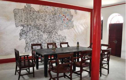 軍委總司令辦公室(作戰(zhàn)室)在遵義會(huì)議會(huì)議室正對(duì)的樓下,面積為56平方米,兩間長(zhǎng)方形的房間組成,中間布一道可折疊的六合門(mén)。屋子正中陳列著兩張黑漆大方桌,桌上有鐵座馬煙、訂書(shū)機(jī)、中華蘇維埃共和國(guó)革命軍事委員會(huì)信 、報(bào)紙做的信封、30年代商務(wù)印書(shū)館出版的中國(guó)分省地圖冊(cè)以及《陳中日記》等。屋子的西窗下陳列著兩張三屈桌,桌上置西部皮包電話機(jī),桌下立著線拐子。東窗下陳列著一對(duì)灰褐色的鐵皮公文挑箱。北壁上陳列著一幅巨大的云、貴、川三省接壤地區(qū)的軍用地圖,當(dāng)年軍委副主席周恩來(lái)、紅軍總司令朱德、總參謀長(zhǎng)劉伯承等經(jīng)常在這里辦公。