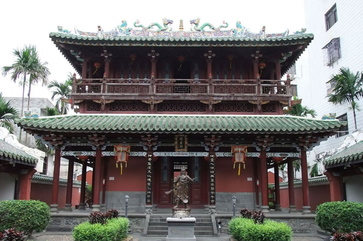 府城鼓樓位于府城鼓樓街,原名譙樓,又稱文明樓。始建于明洪武五年(1372年),明清兩代多次重修。臺(tái)基為明成化十七年(1481年)擴(kuò)建而成,長(zhǎng)28米,寬24米,高6.39米。兩拱門,寬4.6米,高7.1米,門額分刻“海南壯觀”、“奇甸文明”。現(xiàn)存鼓樓為清乾隆五十三年(1788年)重修,坐北朝南,面闊五間19.9米,進(jìn)深三間9.95米,高7.56米,歇山頂,脊飾二龍朝日。樓內(nèi)原有明正統(tǒng)元年(1436年)銅禁鐘一口,鐘銘記述了捐資鑄鐘情況及祈求國(guó)泰民安之意,現(xiàn)存五公祠。