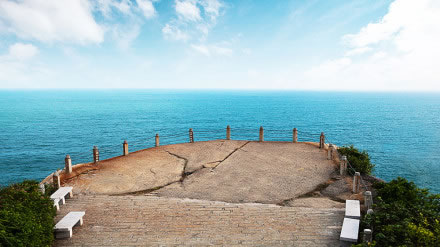 觀日巖位于蜈支洲島的東南懸崖處。站在巖上憑海臨風(fēng),俯瞰全島,遼闊的南海盡收眼底。懸崖下面,怪石嶙峋。 風(fēng)平浪靜之時(shí),乘快艇環(huán)島游,石景千奇百怪,觀日巖像一尊天然大石佛,面向大海,日夜修煉。新世紀(jì)的曙光從這里升起,緋紅的太陽(yáng)從海面上徐徐上升,形成海天一色的海上觀日點(diǎn)。住島客人若欲觀看日出,可向酒店前臺(tái)咨詢(xún)?nèi)粘鰰r(shí)間。