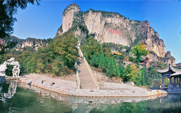 抱犢寨風(fēng)景名勝區(qū)是國(guó)家AAAA景區(qū),位于河北省石家莊市鹿泉市境內(nèi),距石家莊市16公里,距首都北京288公里。抱犢寨,舊名抱犢山,古名萆山,是一外集歷史人文和自然風(fēng)光為一體的名山古寨。它東臨華北平原,西接太行群巒,一峰突起,崢嶸雄秀,四周皆是懸崖絕壁,遠(yuǎn)望猶如巨佛仰臥,眉目畢肖。山頂平曠坦夷,有良田沃土660畝,土層深達(dá)66米,異境別開,草木繁茂,恍如世外桃源。有“天下奇寨”、“抱犢福地”、“全國(guó)最大山頂園林”等美譽(yù)。其景點(diǎn)均集中在寨頂平臺(tái)之上,有全國(guó)最大的山頂門坊南天門、道教宮觀金闕宮、全國(guó)最大的山頂?shù)叵率裎灏倭_漢堂、華夏第一龍壁千龍壁以及牛郎織女故事的發(fā)祥地——牛郎織女家、天池、天堂街、環(huán)山長(zhǎng)城等諸多景點(diǎn);公元前204年漢將韓信曾于此萆山設(shè)伏、背水一戰(zhàn)、大破趙軍,因而寨頂建有韓信點(diǎn)將臺(tái)和韓信祠。金末元初,金恒山公武仙曾于此山屯兵建寨,抗擊蒙古軍隊(duì)。在道教典籍中,該山被列為“北岳佐命”,明代著名道士張三豐也曾游歷此山,留下了“三豐派”一支脈,至今相傳不絕,宮觀猶存。近年來(lái),景區(qū)大力實(shí)施升級(jí)改造工程,重修了登山路;開發(fā)建設(shè)了以音樂(lè)噴泉、讀月臺(tái)、天井飛瀑、彩虹谷、思凡亭等景點(diǎn)為主的鹿隱源生態(tài)新區(qū)。并增加了具有鮮明特色的少數(shù)民族歌舞演出,景區(qū)魅力倍增。