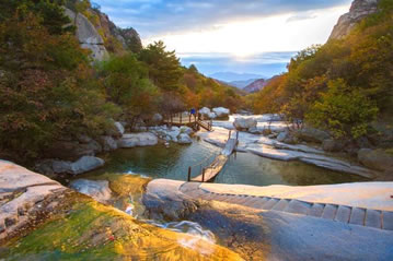 夏季,風(fēng)涼氣爽,云蒸霞蔚。登臨主峰,可觀云海,看日出,瞧佛光,俯群山。云海、云流、云瀑是祖山夏季的特有景觀。因祖山海拔較高,又瀕臨渤海,此時登臨任何峰頂,可觀到滔滔的云海,觸摸到擦肩而過的朵朵白云,她們一會兒行云流水,環(huán)山而淌;一會兒宛如融雪的春潮,裊裊地升入蔚藍(lán)的天空;一會兒像脫結(jié)的野馬,入海的姣龍,奔騰咆哮,排山倒海。當(dāng)你倘佯在“北龍?zhí)丁薄ⅰ盎ü健本皡^(qū)時俯看谷中,涓涓細(xì)流,清澈見底;仰望山間,瀑布飛掛,奔騰咆哮,大有“飛流直下三千尺,疑是銀河落九天”之氣魄沿溝谷而下,那真是水繞青山,山繞水,山浮綠水,水浮山。
