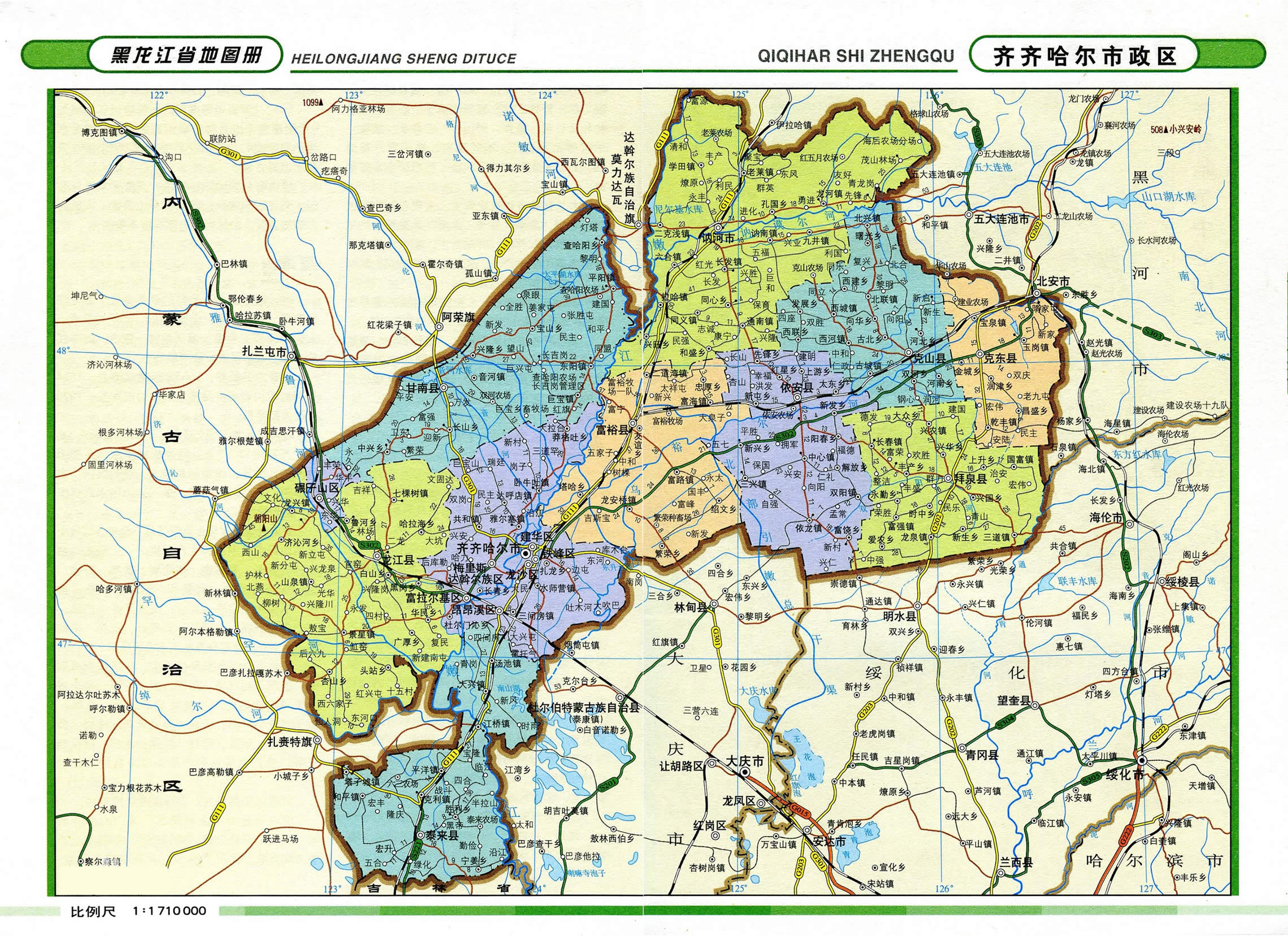 龍江縣 面積6175平方千米,人口414285,政府駐龍江鎮(zhèn),下轄8個鎮(zhèn)、6個鄉(xiāng)