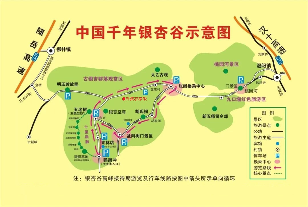 2、隨州:從隨州市區(qū)出發(fā),沿迎賓大道(在隨州職業(yè)技術學院、白云山國賓酒店斜對面約2公里)左轉,過 浪河村抵達洛陽鎮(zhèn)千年銀杏谷景區(qū),全程31公里。