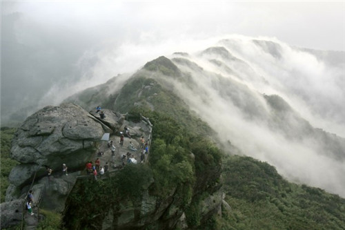 祝融峰是衡山的最高峰,是中國紀(jì)念人文祖先祝融氏的山峰。“祝融峰之高”為南岳風(fēng)光“四絕”之首。由于常年煙云的烘托和群峰的疊襯,加之它矗立于地勢相對低洼的湘南盆地之中,更顯得它峻極天穹。在古語中“!笔浅志糜肋h(yuǎn)之意,“融”是光明之意,“祝融”是永遠(yuǎn)光明。唐代大文豪韓愈在《游祝融峰》詩中贊嘆道“萬丈祝融拔地起,欲見不見輕煙里”。北宋黃庭堅寫道:“萬丈祝融插紫霄,路當(dāng)窮處架仙橋。上觀碧落星辰近,下視紅塵世界遙!贝颂帪閿埲悍澹慈粘觯^云海,賞雪景的最佳去處。