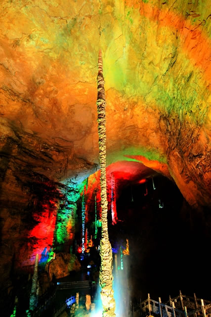 雪松是龍宮的第三大奇觀,也是黃龍洞內(nèi)生長(zhǎng)速度最快的一根石筍,它通體雪白,高達(dá)17米,巍然聳立在龍宮大廳西端的斜坡上,“大雪壓青松,青松挺且直”就是它的真實(shí)寫(xiě)照!把┧伞钡目茖W(xué)名稱(chēng)叫棕櫚狀石筍,是洞頂?shù)嗡捌洚a(chǎn)生的飛濺水共同作用的結(jié)果,一般只有在空間較為高大的廳堂才能看到。根據(jù)其根部的棕櫚片取樣分析,“雪松”挺立在這里已經(jīng)有9.6萬(wàn)年的時(shí)間了,因此也叫它“萬(wàn)歲松”。
