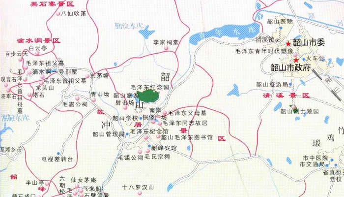 韶山市位于湖南省中部偏東的湘中丘陵區(qū),地理坐標(biāo)為東經(jīng)112°23′52〞-112°38′13〞、北緯27°51′40〞-28°1′53〞。位于湘鄉(xiāng)、寧鄉(xiāng)、湘潭交界處、距湘潭市40公里,距長(zhǎng)沙市120公里,人口10萬(wàn)。相傳舜帝南巡到此,見(jiàn)風(fēng)景優(yōu)美,遂奏韶樂(lè),引鳳來(lái)儀,百鳥(niǎo)和鳴,又傳“韶氏三女得道于此,有鳳鳥(niǎo)銜天書到,女皆仙去。”韶山故此得名,F(xiàn)屬湘潭市。湖南省設(shè)韶山管理局。韶山,群山環(huán)抱,峰巒聳峙,氣勢(shì)磅礴,翠竹蒼松,田園俊秀,山川相趣。韶峰為南岳七十二峰之一,色彩神奇;青年水庫(kù)融藍(lán)天,映青山,碧波蕩漾;慈悅庵的六朝松,神秘的“西方山洞”——滴水洞、虎歇坪、滴水洞八景屏等著名景觀,點(diǎn)綴靈秀山川。