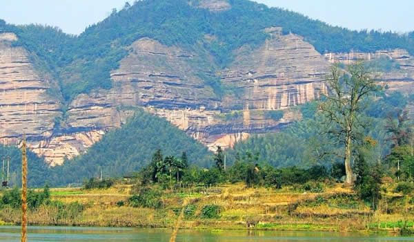 銅梁山位于湘潭縣石鼓鎮(zhèn)境內(nèi),山脈海拔700多米,地勢(shì)極為偏僻,正好處于湘潭縣與雙峰縣的交界之處。銅梁山名稱(chēng)由來(lái)還有個(gè)美麗的傳說(shuō)。在雙峰縣井字鎮(zhèn)與湘潭縣、湘鄉(xiāng)市交界處,有一座大山叫昌山。主峰靈應(yīng)峰海拔755.1米,是南岳72峰之一。在主峰與鷹尖石之間,橫臥著一條長(zhǎng)達(dá)2公里的一字形平脊嶺,當(dāng)?shù)厝私兴?ldquo;一字大脊”。相傳有一仙人挑著兩個(gè)大小不一的籮筐,掌燈時(shí)分就來(lái)到了大山腳下的花山村。熱情好客的花山人見(jiàn)了這位外來(lái)客人,格外歡喜,他們以美酒佳肴相陪,不知不覺(jué)已到雞鳴。仙人突然想起師父“雞鳴前一定要翻過(guò)大山”的教誨,趲告辭,挑起擔(dān)子飛也似的上山去?墒,送客的花山人一會(huì)兒便發(fā)現(xiàn),那人的擔(dān)子擱在了山頂,扁擔(dān)成了一條“一字脊”,兩個(gè)籮筐便成了一字脊兩端的“巒柱”,形似一個(gè)巨大的銅梁。因此,銅梁山這個(gè)美名便叫開(kāi)了。