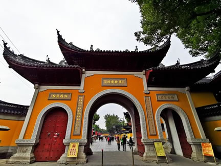 寒山寺殿宇大多為清代建筑,主要有大雄寶殿、藏經(jīng)樓、鐘樓、碑廊、楓江樓、霜鐘閣等。寒山寺的建筑布局沒有嚴格的中軸線。寒山寺山門前面的石拱圈古橋是江村橋,橋堍與山門之間那垛黃墻稱照壁。山門兩旁兩棵古樟。黃墻內(nèi)古典樓閣飛檐翹角,右為楓江樓,左為霜鐘樓,都源于楓橋夜泊詩。佛龕背后一尊威風(fēng)凜凜的將軍像,面朝里,對著大雄寶殿,手拿金剛杵,也叫降魔杵,那是韋馱,位居四大天王手下的三十二神將之首。