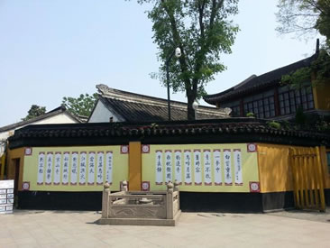 寒山寺的主庭園左側(cè)的花壇兩面嵌長條石刻兩塊,一為明代崇幀年間刻的"寒拾遺蹤";另一刻清末江蘇巡撫程德全寫的"妙利宗風(fēng)"。出大雄寶殿,左通普明寶塔和方丈室,右達名聞遐邇的聽"夜半鐘聲"的鐘樓,正前方的兩層屋宇是藏經(jīng)樓。遠望屋頂,可見唐僧、孫悟空等西天取經(jīng)塑像群。藏經(jīng)樓樓上秘藏珍貴佛經(jīng),樓下叫"寒拾殿",寒拾殿后墻的背面立一巨碑,刻著千手千眼觀音、韋馱和關(guān)公等人物。鐘樓就在寒拾殿旁。