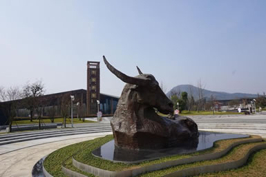 佛頂前苑,牛首山2018年全新景點,以10萬方自然山水和小品景觀展現(xiàn)了牛首山深邃的多元文化。佛頂前苑作為通向佛頂寺、佛頂宮的重要通道,設(shè)置了天闕攬勝文化景墻、集賢橋、十牛圖塑石假山、心銘墻、法融廣場、心蓮廣場、停心湖、趣牛園以及晚紅小徑等15處觀景節(jié)點。整體通過三個層次的景致——前景“蜓戲紅蓮水映天”,中景“霧起白虹飄玉帶”,遠景“寺宇山色有無中” 構(gòu)成一幅靜謐秀麗的山林水墨畫卷,盡顯牛首山“隱秀”的環(huán)境氣質(zhì)。