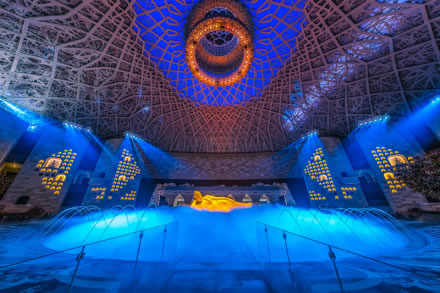 禪境大觀,南北長112米,東西寬62米,內(nèi)部凈高約41.2米,涵蓋了地上三層。整個空間面積超過6000㎡,呈橢圓形,以黃、白、灰三色為基調(diào),布置出人間山水,從而讓人們在行走之際領(lǐng)略禪意。由佛陀出生、成道的禪境花園及中間的如蓮劇場三個部分組成,展現(xiàn)了佛祖一生的行跡。