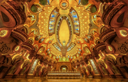 作為佛頂圣境區(qū)的核心之一,佛頂宮坐落于牛首山西峰之處,建基于歷史遺留礦坑之上,總建筑面積約13.6萬平方米,與佛頂塔共同構(gòu)成牛首西峰新景象,與牛首東峰遙相呼應(yīng),再現(xiàn)牛首“雙峰雙闕”并峙的宏偉盛景。整個佛頂宮以佛祖頂骨舍利供奉為主題,外部分為大穹頂和小穹頂兩個部分,寓意外供養(yǎng)和內(nèi)供養(yǎng)。大穹頂形如佛祖袈裟覆蓋在小穹頂之上,象征著佛祖的無量加持;小穹頂下部為蓮花寶座造型,上部為摩尼寶珠造型,上下結(jié)合形成“蓮花托珍寶”的神圣意象。