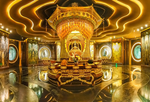 舍利藏宮又稱佛寶層,整體以暗色調(diào)為主,營造出莊重的氛圍。由三廳一廊、藏宮大殿(舍利寶幢、拼畫、四大菩薩)、參拜環(huán)廊三部分組成。這里既是珍藏佛祖頂骨舍利的神圣之地,又是信眾禮佛參拜、靜坐禪修的神秘空間。長廊長66米,根據(jù)六波羅密的供養(yǎng)內(nèi)涵,即持戒、布施、忍辱、精進、禪定、智慧布局,分別是香供廳、燈供廳、水供廳以及花供長廊。