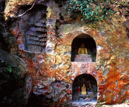 明代摩崖石刻,位于牛首山東峰兜率巖北崖,距弘覺寺塔約一百米。崖壁上共開鑿5個佛龕,北壁3個,東壁2個,共有133尊雕像。石刻整體呈“幾”字形,三面巖石南北長11.5米,東西寬5.8一8米,中間圍合成約77平方米的平地空間,正窟面對祖堂山主峰獻花巖。石刻包括佛像、題刻。5座佛龕內(nèi)每座佛龕所雕數(shù)目不等。在石壁正中一龕里,僅雕釋迦牟尼像,高1.78米,結(jié)跏趺壘,施禪定印,下為高0.39米仰覆蓮須彌座,雕刻較為粗糙。在龕外左右兩壁上刻有記載牛首山“敕賜弘覺禪寺”所屬范圍的文字。距該龕東西兩側(cè)約3米處各有一龕,東龕上下九層共75尊,最下層為環(huán)立武僧。上面皆為盤膝打坐的修士,但絕大多數(shù)已有損毀。西龕則雕鑿在“幾”字形的側(cè)壁上,其內(nèi)容、風格與東龕相同。在西龕的下部相距高約0.39米處,另有一小龕,內(nèi)鑿高0.45米的彌勒像一尊,藝術(shù)造詣較高于其他諸像,且龕外石壁右側(cè)刻有“大明成化元年歲次乙酉五月五日口口真定成造彌勒佛一尊永遠供養(yǎng)”的題記。佛龕兩側(cè)尚刻有四處梵文,其東壁南側(cè)的巖石上,鐫一行梵文,寬約1.6米,另有《題感應(yīng)泉詩》一首,詩系刻在石壁上,長0.5米,寬0.32米,每字約4厘米,有11行,滿行8字,共83字,除去4字已剝蝕外,其余79字清晰可辨。