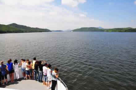 天目湖旅游度假區(qū),位于蘇、浙、皖三省交界處的江南歷史名城,溧陽市境內(nèi),距市區(qū)僅八公里。天目湖東臨煙波浩渺的太湖,北望工業(yè)發(fā)達(dá)的常州,西接六朝古都南京,南連蜿蜒起伏的天目山脈。天目湖旅游度假區(qū)開發(fā)建設(shè)于一九九二年四月,整個(gè)度假區(qū)的范圍為三百平方公里,其中包括沙河和大溪兩座國家級大型水庫。這兩大水庫地處天目山的余脈,從空中鳥瞰恰似兩顆明珠鑲嵌于溧陽大地。天目湖湖水來源于蘇、浙、皖三省交界的南山地區(qū),二百五十平方公里的河澗水匯集成湖,總庫容量為三億立方米,總長度為十三公里,水庫最深處為二十八米,平均深度為十米左右。湖區(qū)陸地部分為安山巖和石灰?guī)r,地形較為低緩。湖區(qū)群山環(huán)抱,湖水清冽。湖岸蜿蜒曲折,湖內(nèi)布滿大小島嶼。區(qū)內(nèi)奇花異草,色彩繽紛,野生動(dòng)物,棲息繁衍,形成完整與和諧的生態(tài)系統(tǒng)。