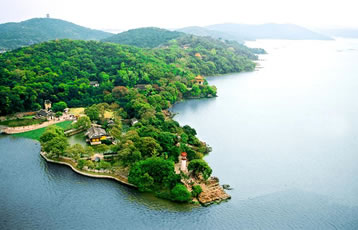 原稱三山島,位于黿頭渚西南2.6千米的湖中,有“三山映碧”譽稱。島上建有三山道院,有會仙橋、天街、靈霄宮、天都仙府、月老祠、大覺灣等建筑。玉宇瓊樓,古樂陣陣,室內布置瑰麗雄奇,神像生動,其中玉帝塑像高達18米。