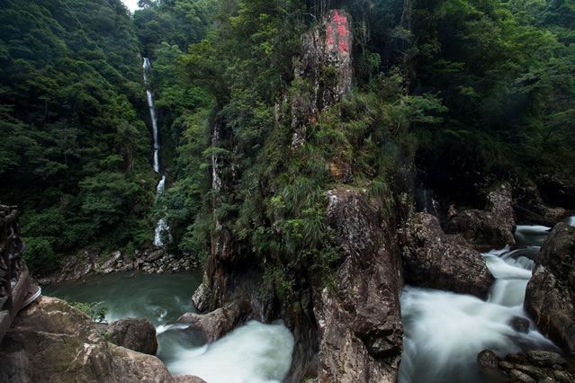 東江第一瀑由福鰲塘和山上大小溪流匯集而成,瀑布單級(jí)落差120多米,是目前景區(qū)發(fā)現(xiàn)單級(jí)落差最大的常流瀑布,氣勢(shì)雄偉,兩側(cè)峭壁凌空,古木參天。飛瀑前方視野開(kāi)闊,遠(yuǎn)處青山疊翠,林海蒼茫,令人心曠神怡。石壁上東江源三個(gè)字是由全國(guó)政協(xié)原副主席葉選平題寫(xiě)。