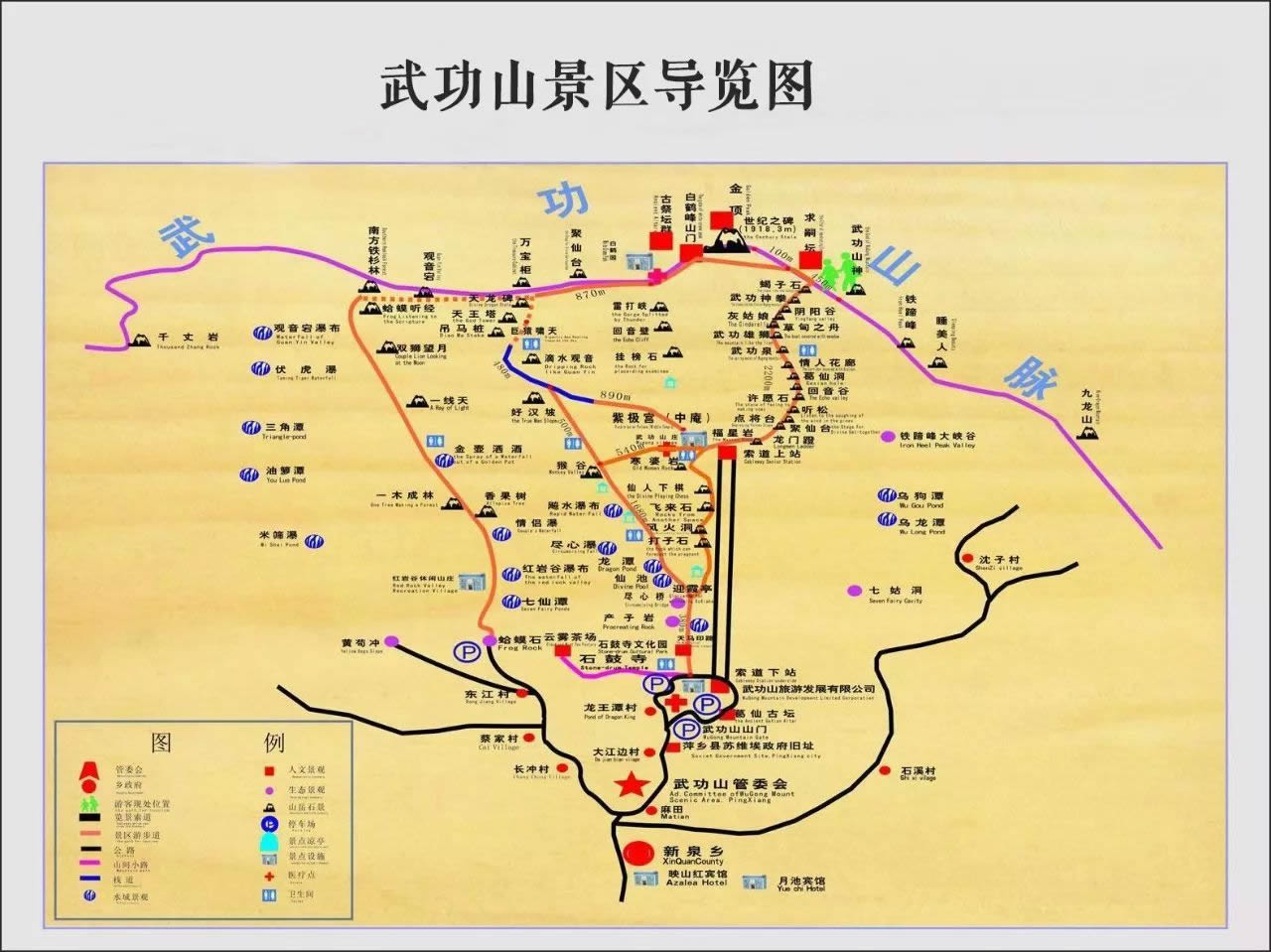 一級景點:睡美人、金壺灑酒、夫妻瀑、米篩潭、金頂日出、武功山云海。