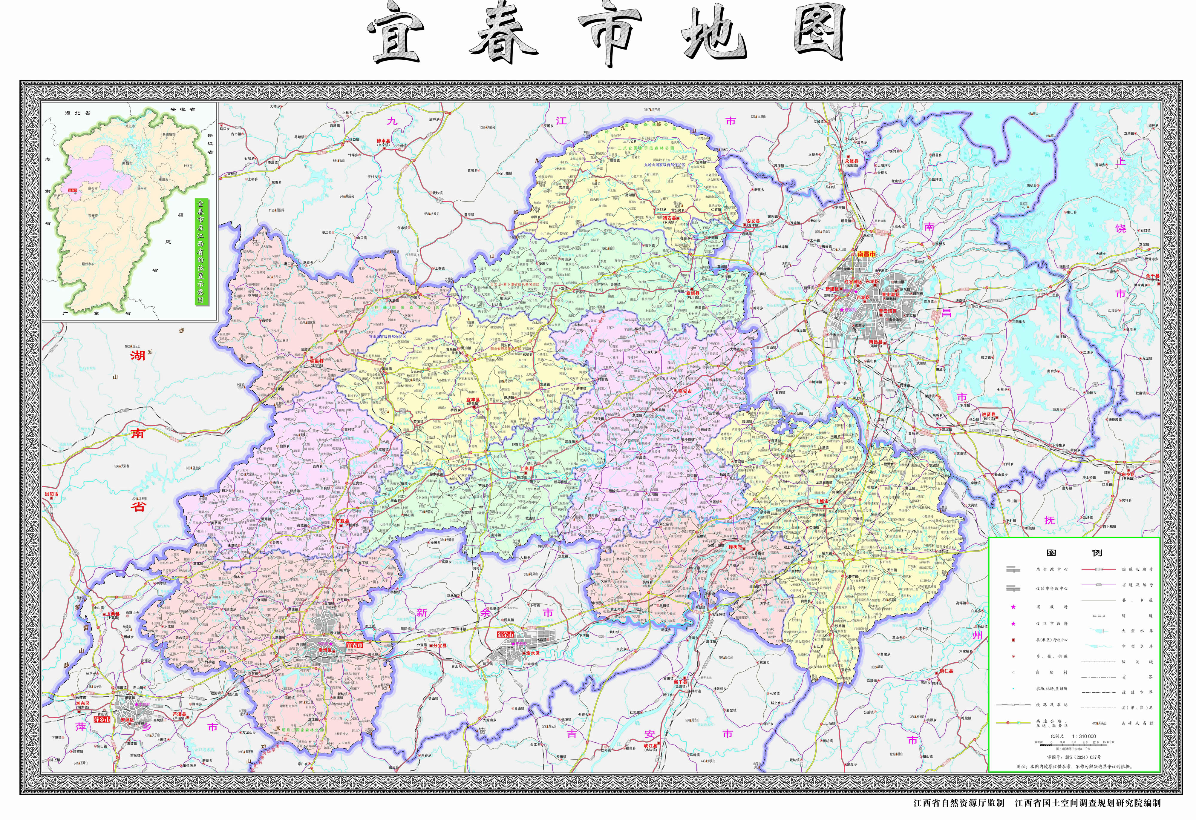 宜春市位于江西省西北部,東境與南昌市接界,東南與撫州市為鄰,南陲與吉安市及新余市毗連,西南與萍鄉(xiāng)市接壤,西北與湖南省的長(zhǎng)沙市及岳陽(yáng)市交界,北與九江市相鄰。境內(nèi)東西長(zhǎng)約222.75千米,南北寬約174千米,總面積1.87萬(wàn)平方千米。