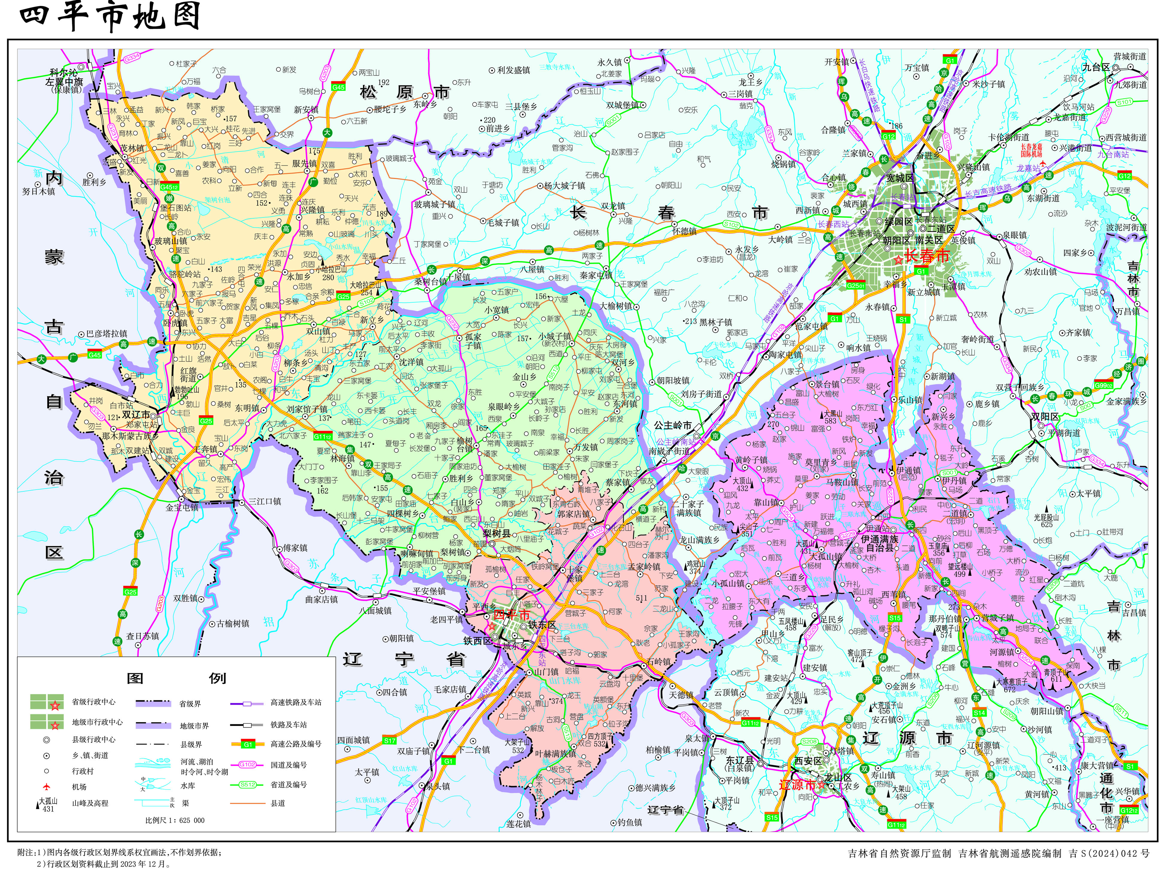 四平市轄2個市轄區(qū),2個縣,代管1個縣級市: