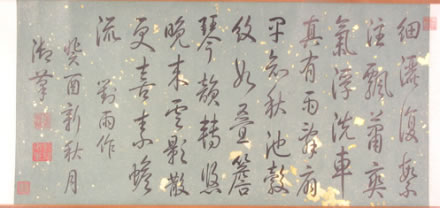 清弘歷行書對雨詩卷:此書卷作于乾隆十八年(1753)。綠色片金蠟箋紙。引首騎縫鈐篆書朱文“石渠寶笈所藏”方印,行書寫自作五言律詩一首,全詩為“細灑復絮注,飄蒲爽氣浮。洗車真有雨,壽扇果知秋。池轂紋如疊,檐琴韻轉悠。晚來云影散,更喜素蟾流。”詩后自題“對雨作”,后署款“癸酉新秋月,御筆”。