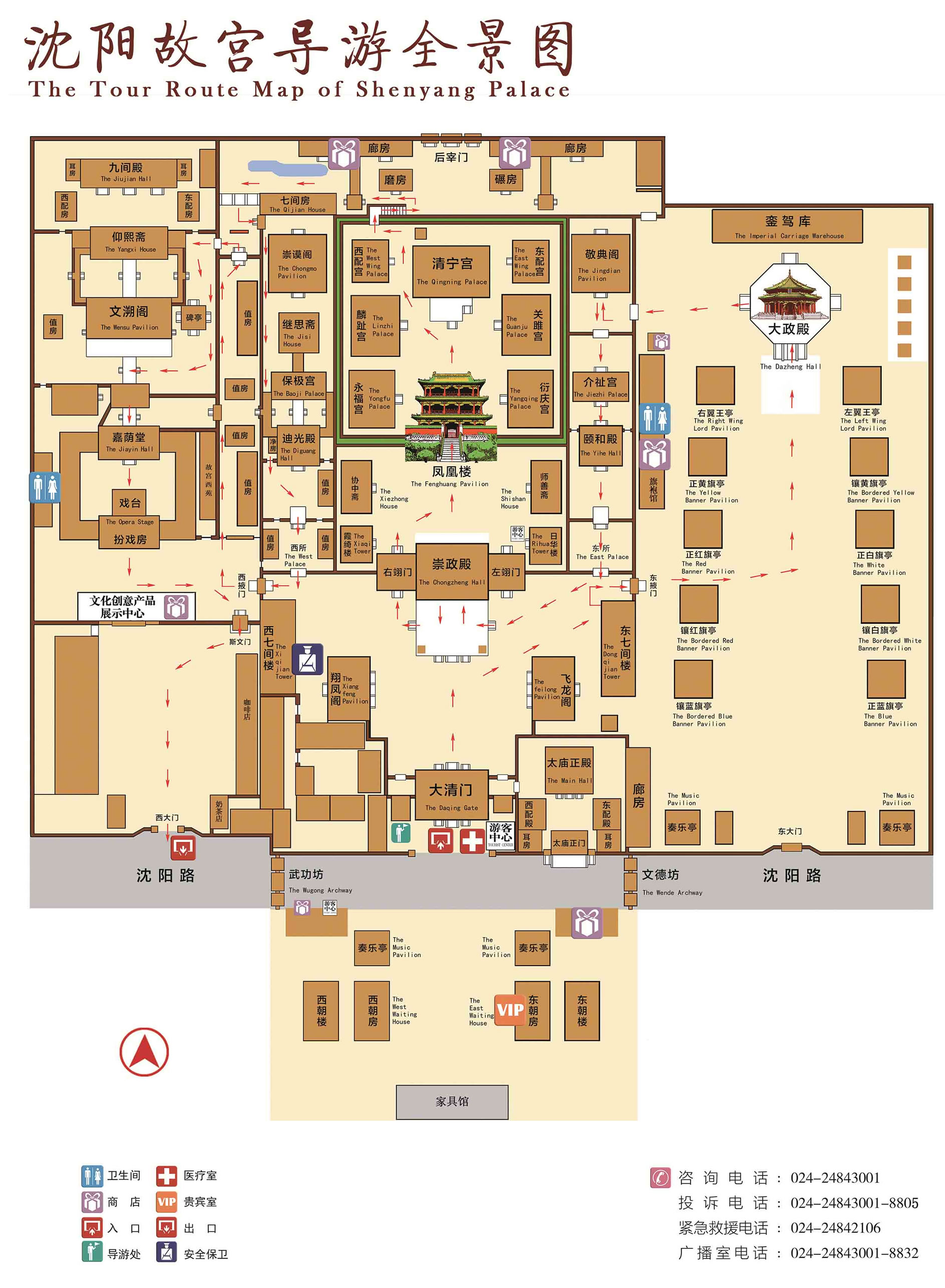 沈陽故宮占地面積六萬多平方米,有古建筑114座,500多間,保存完好,是一處包含著豐富歷史文化內涵的古代遺址。在宮廷遺址上建立的沈陽故宮博物院是著名的古代宮廷藝術博物館,藏品中包含十分豐富的宮廷藝術品。它以獨特的歷史、地理條件和濃郁的滿族特色而迥異于北京故宮。沈陽故宮那金龍蟠柱的大政殿、崇政殿,排如雁行的十王亭、萬字炕口袋房的清寧宮,古樸典雅的文朔閣,以及鳳凰樓等高臺建筑、“宮高殿低”的建筑風格,在中國宮殿建筑史上絕無僅有。