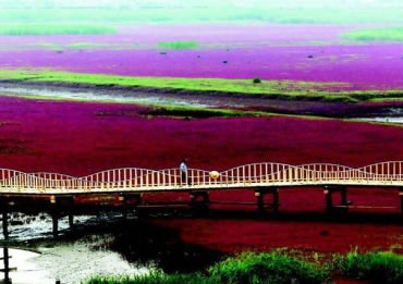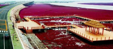 這里是遼河口和渤海的交界處,兩河水不斷地沖刷翅堿蓬,翅堿蓬會(huì)越來(lái)越紅。初一、十五大潮時(shí)海水蓋過(guò)翅堿蓬,成為一片大海的奇觀,潮落后,鮮艷的翅堿蓬依然矗立在泥潭中。