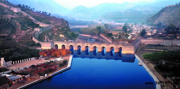 九門口長城:坐落在遼寧省綏中縣李家鄉(xiāng)新臺子村境內,距山海關15公里,全長1704米。其南端起于危峰絕壁間,與自山海關方向而來的長城相接。自此,長城沿山脊向北一直延伸到當?shù)氐木沤幽习叮趯掃_百米的九江河上,筑起規(guī)模巨大的過河城橋,以此繼續(xù)向北逶迤于群山之間。“城在水上走,水在城中流。”便是人們對九門口長城的形象描述。