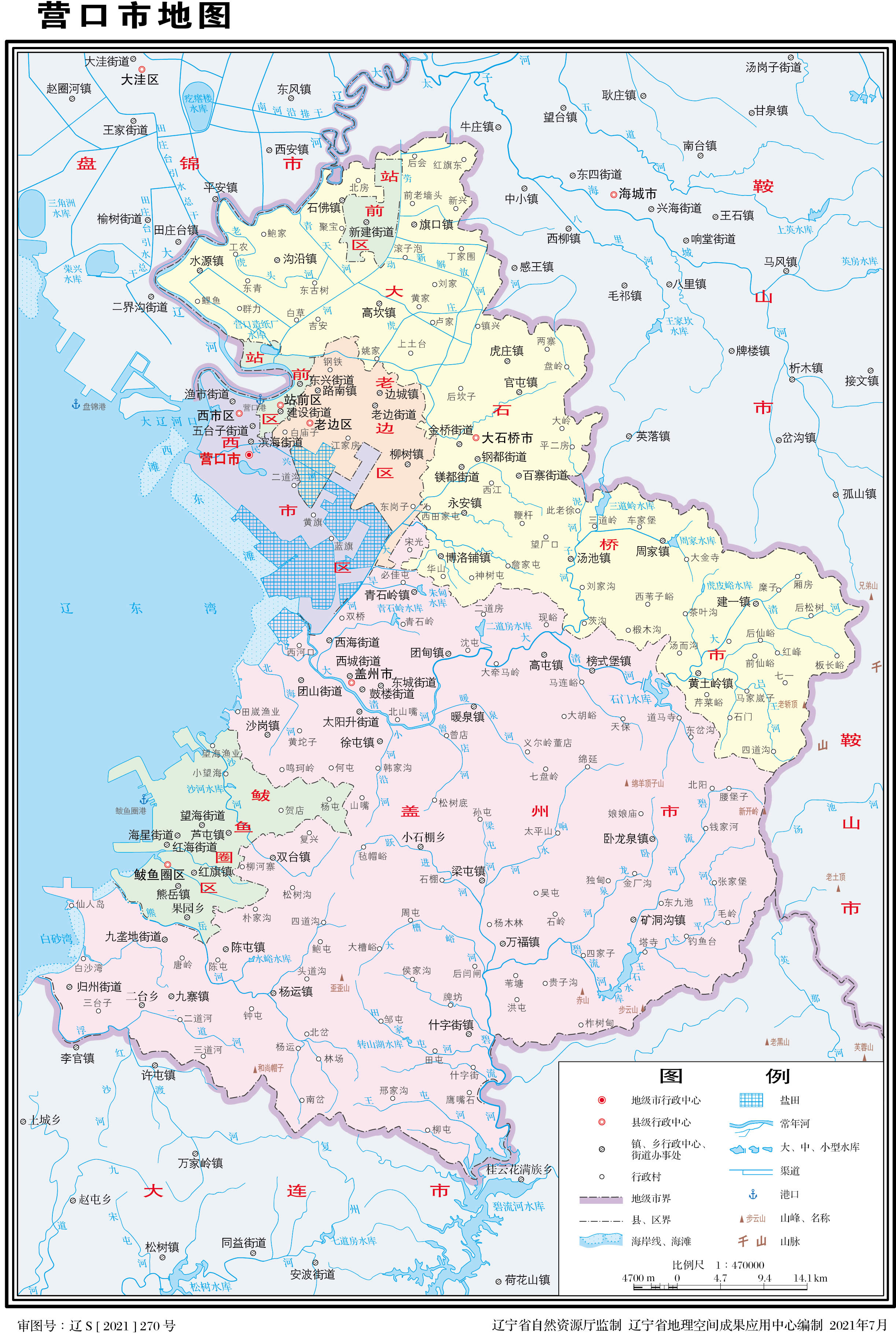 1985年1月,國務(wù)院批準(zhǔn)盤錦設(shè)市,將營口市管轄的盤山縣、大洼縣劃歸盤錦市管轄。營口市共轄蓋縣、營口縣及站前、西市、老邊和鲅魚圈四區(qū)。